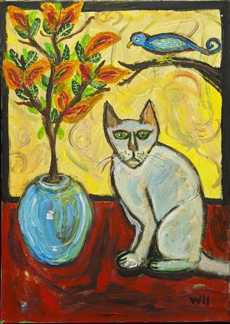 Wolf Howard (British, b.1968), Blue Bird and Cat, oil on canvas, signed lower right WH and to verso, H.60cm W.42cm