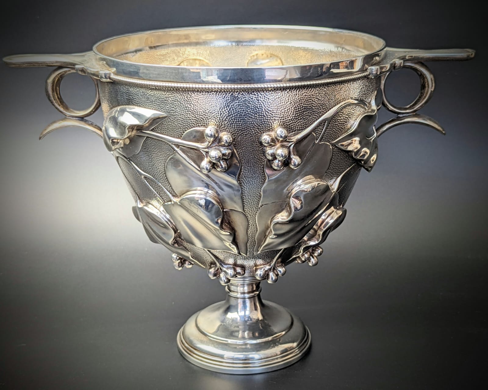A Victorian silver Skyphos cup, repousse body with chased berries and ivy against a pounced ground, twin handles, raised on a tapering foot, gilt interior, hallmarked London, 1900, maker Edward Barnard & Sons Ltd, 1120g, H.20.5cm D.29cm (over the handles)